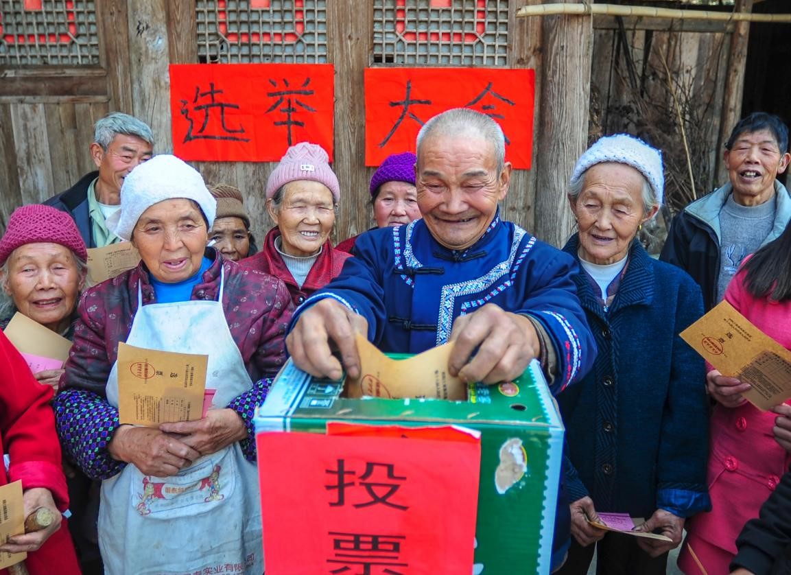 Residents in Huijia village, Dingshi township, Youyang Tujia and Miao autonomous county, southwest China's Chongqing municipality put votes in a ballot box for the election of deputies to the National People's Congress, Dec. 5, 2021. (People's Daily Online/He Yi)