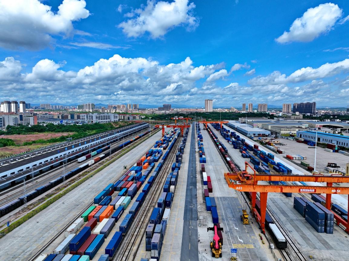 Containers of exported furniture and imported wood materials are being handled by gantry cranes at an international land port in Ganzhou, east China's Jiangxi province, Aug. 6, 2022. (People's Daily Online/Zhu Haipeng)