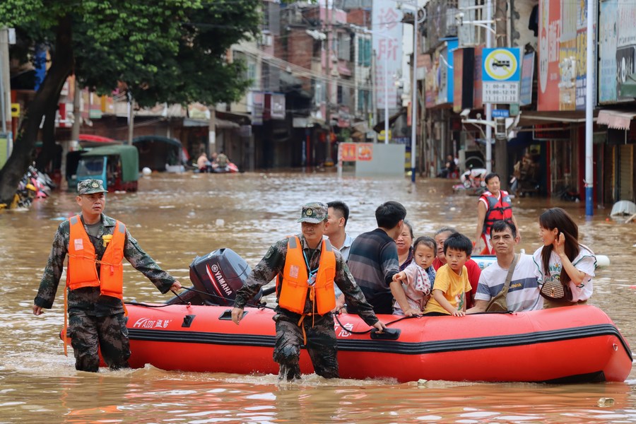 Rescuers evacuate stranded residents in flood water in Tuojiang Township, Jianghua Yao Autonomous County, Yongzhou, central China's Hunan Province, June 22, 2022. (Photo by Jiang Linfeng/Xinhua)