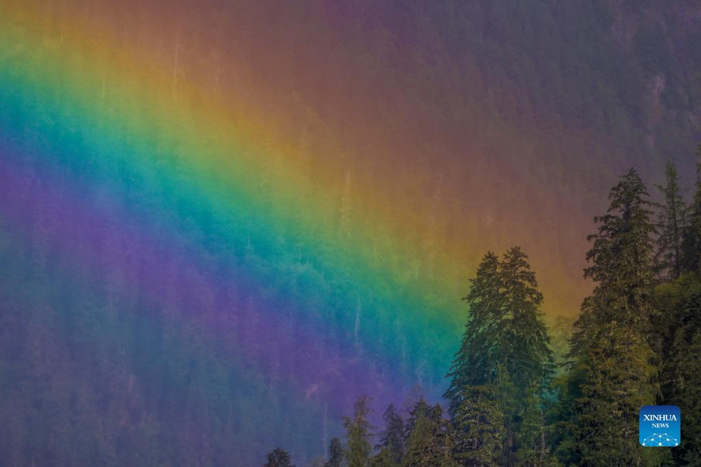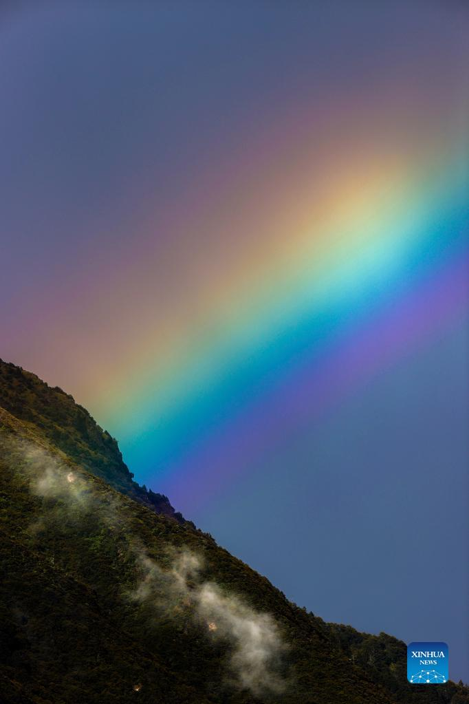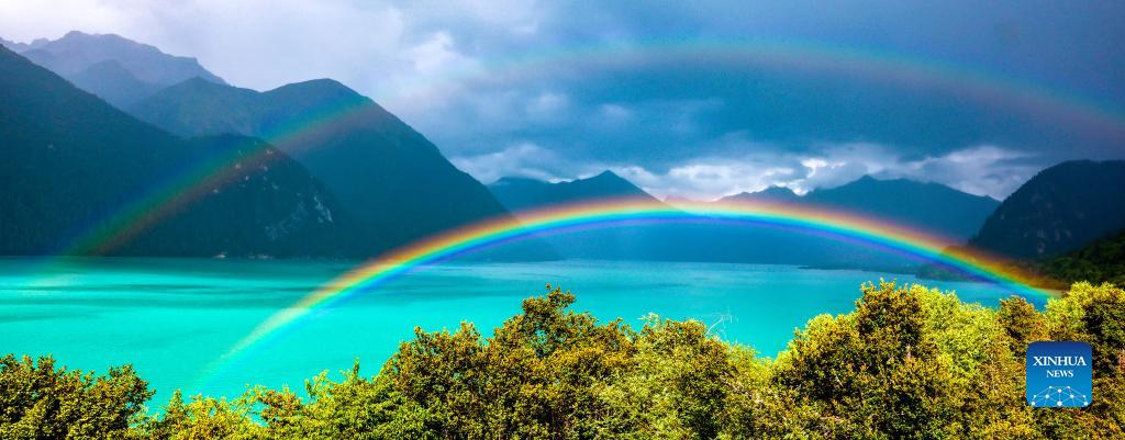 A rainbow appears in the sky over the Basum Lake in the city of Nyingchi, southwest China's Tibet Autonomous Region, Aug. 29, 2022. (Xinhua/Jiang Fan)