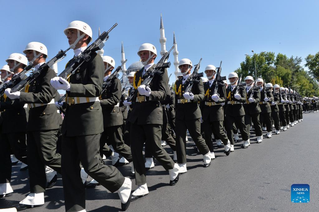 Turkish soldiers march during a parade to mark the 100th anniversary of Victory Day in Ankara, Trkiye, on Aug. 30, 2022. Trkiye celebrated on Tuesday the 100th anniversary of Victory Day, marking the Turkish victory against Greek forces in a decisive battle during the Turkish War of Independence in 1922. (Photo by Mustafa Kaya/Xinhua)