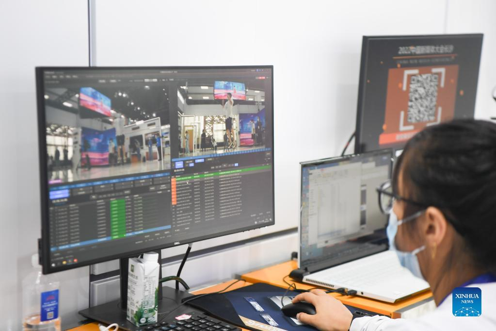 A staff member shows a space-time condensation system based on the free-viewpoint model during the 2022 China New Media Conference in Changsha, central China's Hunan Province, Aug. 30, 2022. The 2022 China New Media Conference, organized by the All-China Journalists Association and the publicity department of the Communist Party of China (CPC) Hunan provincial committee, kicked off Tuesday in Changsha. (Xinhua/Xue Yuge)