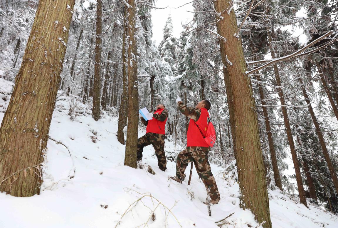 Forest rangers of the management bureau of the Wulingyuan scenic area and Wulingyuan National Park in central China's Hunan province record disease conditions of trees on a patrol mission, Feb. 3, 2022. (Photo by Wu Yongbing/People's Daily Online)