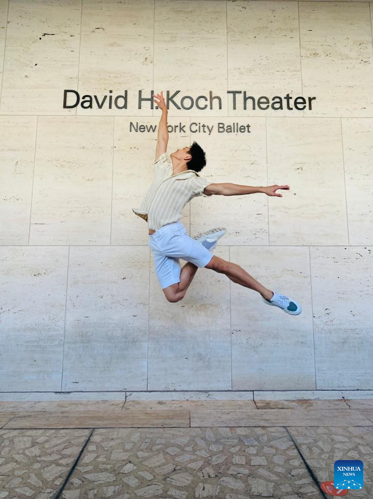 Chinese ballet dancer Chun Wai Chan performs in front of David H. Koch Theater of Lincoln Center in New York, the United States, Sept. 10, 2021. (Xinhua)