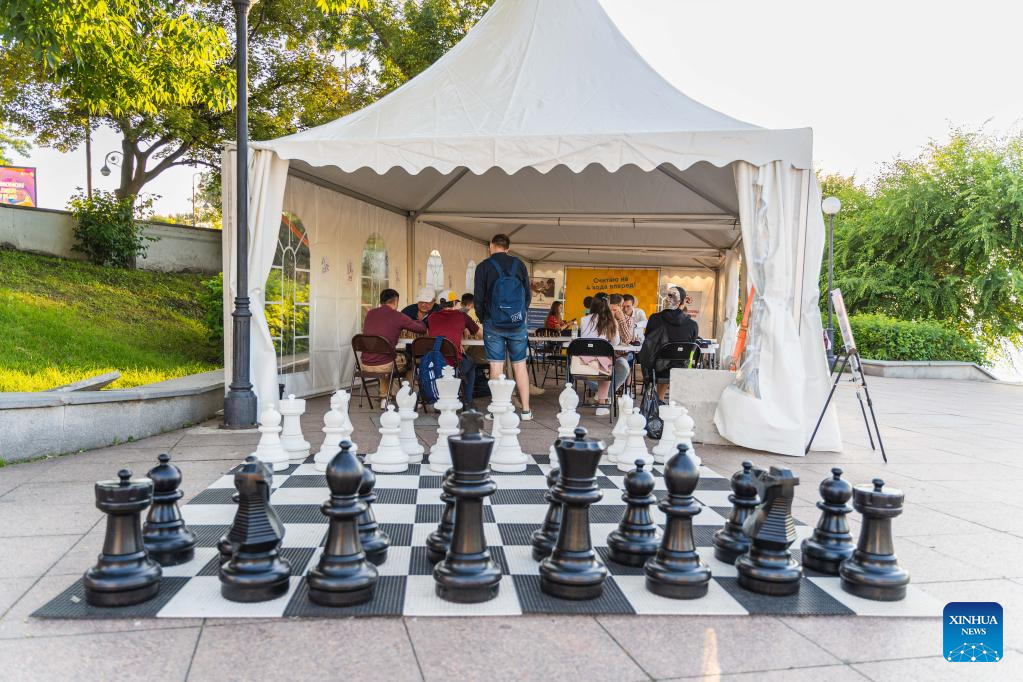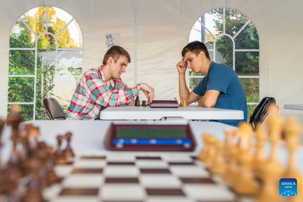 People play chess at a chess tent in Vladivostok, Russia, on Aug. 31, 2022. A chess tent was set up on a street in Vladivostok to promote chess culture. Chess fans can play for free and get guidance from professional tutors. (Photo by Guo Feizhou/Xinhua)