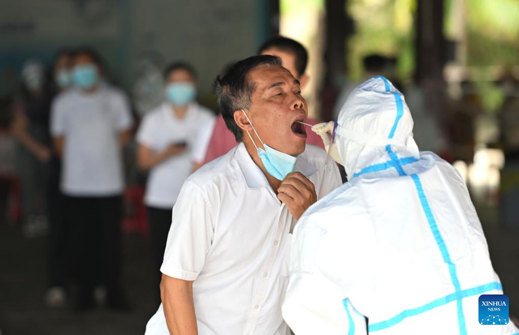 A medical worker takes a swab sample from a man for nucleic acid test in Sanya, south China's Hainan Province, Aug. 26, 2022. (Xinhua/Guo Cheng)
