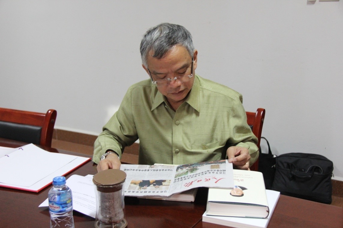 Sommad Pholsena, Vice President of the National Assembly of Laos, reads People's Daily. (People's Daily/Sun Guangyong)