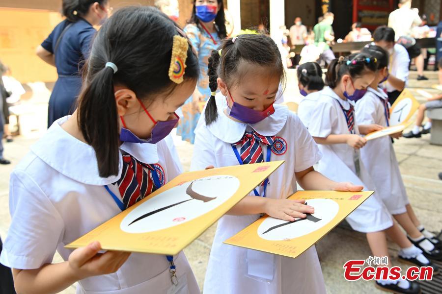 First-grade pupils display their Chinese calligraphy of "Ren" (human) during the first writing ceremony of a new semester at Fuzimiao, or the Confucius Temple in Nanjing, east Chinas Jiangsu Province, Aug. 31, 2022. Students across China embraced their new semester on Thursday. (Photo: China News Service/Yang Bo)