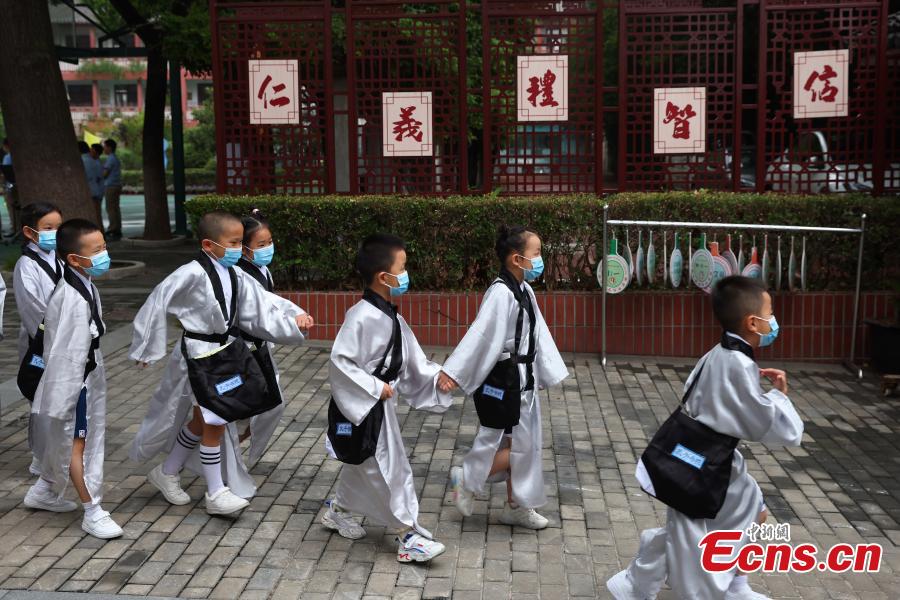 First-grade pupils wearing traditional Chinese uniforms attend the first writing ceremony of a new semester at Fuzimiao, or the Confucius Temple in Nanjing, east Chinas Jiangsu Province, Aug. 31, 2022. (Photo: China News Service/Yang Bo)