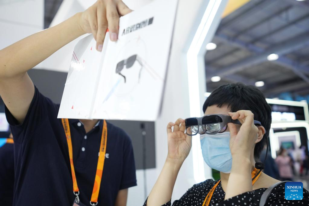 A visitor tries an augmented reality (AR) glass at the 2022 China International Fair for Trade in Services (CIFTIS) in Beijing, capital of China, Sept. 1, 2022. The CIFTIS is held in Beijing from Aug. 31 to Sept. 5. (Xinhua/Ju Huanzong)