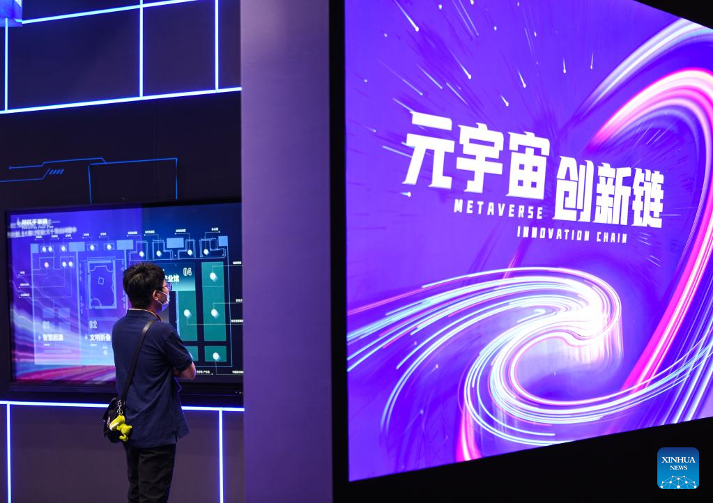 A visitor looks at a screen displaying the development in metaverse innovation chain at the 2022 China International Fair for Trade in Services (CIFTIS) in Beijing, capital of China, Sept. 1, 2022. The CIFTIS is held in Beijing from Aug. 31 to Sept. 5. (Xinhua/Han Xu)
