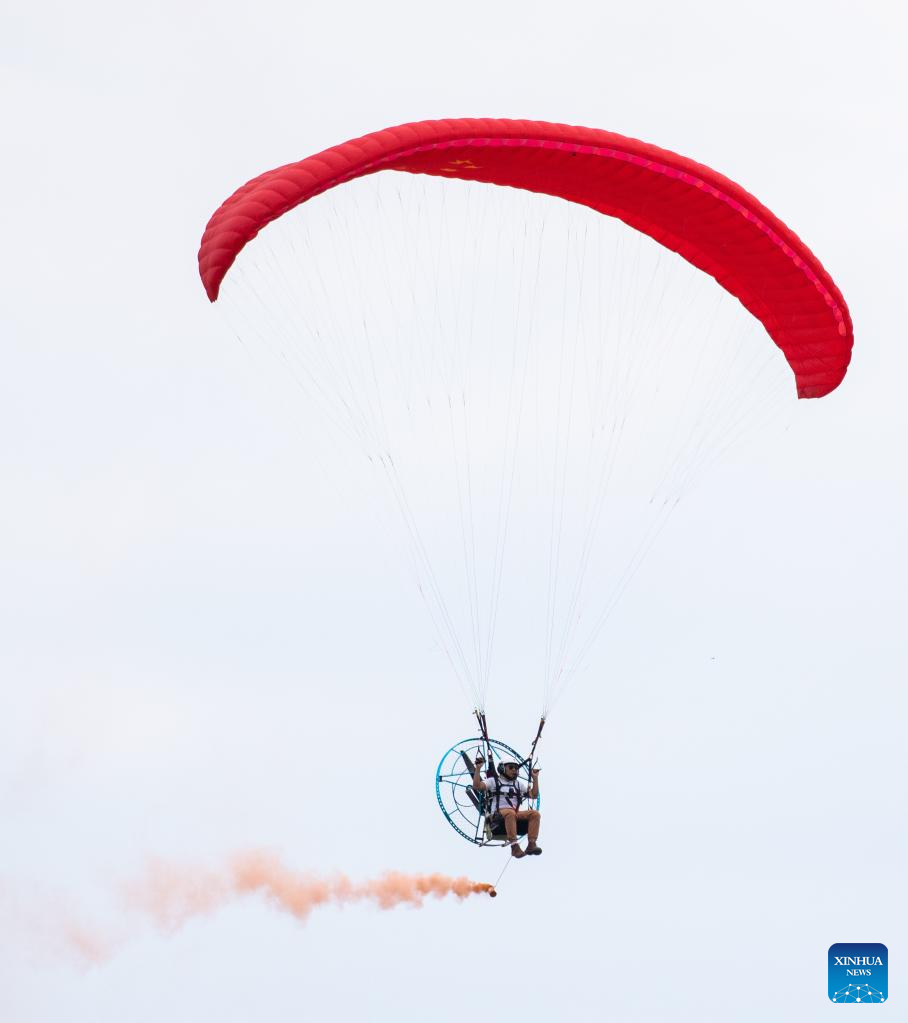 Performance is staged during an air show, which is a part of the 2022 Hunan (International) General Aviation Industry Expo, at the Lusong Airport of Zhuzhou City, central China's Hunan Province, Sept. 1, 2022. The 2022 Hunan (International) General Aviation Industry Expo opened here on Thursday. The expo comprises a static exhibition at the Changsha International Convention and Exhibition Center in Changsha and an air show at the Lusong Airport of Zhuzhou City, both in central China's Hunan Province. (Xinhua/Chen Sihan)