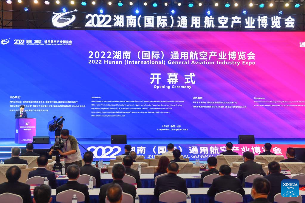 Photo taken on Sept. 1, 2022 shows the opening ceremony of the 2022 Hunan (International) General Aviation Industry Expo at the Changsha International Convention and Exhibition Center in Changsha, central China's Hunan Province. The 2022 Hunan (International) General Aviation Industry Expo opened here on Thursday. The expo comprises a static exhibition at the Changsha International Convention and Exhibition Center in Changsha and an air show at the Lusong Airport of Zhuzhou City, both in central China's Hunan Province. (Xinhua/Chen Zeguo)