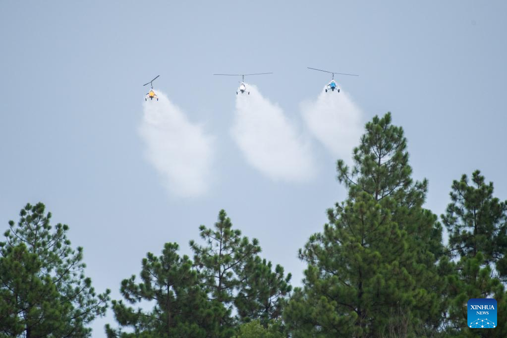 A fleet of gyroplanes fly during an air show, which is a part of the 2022 Hunan (International) General Aviation Industry Expo, at the Lusong Airport of Zhuzhou City, central China's Hunan Province, Sept. 1, 2022. The 2022 Hunan (International) General Aviation Industry Expo opened here on Thursday. The expo comprises a static exhibition at the Changsha International Convention and Exhibition Center in Changsha and an air show at the Lusong Airport of Zhuzhou City, both in central China's Hunan Province. (Xinhua/Chen Sihan)