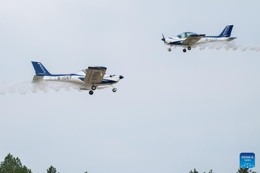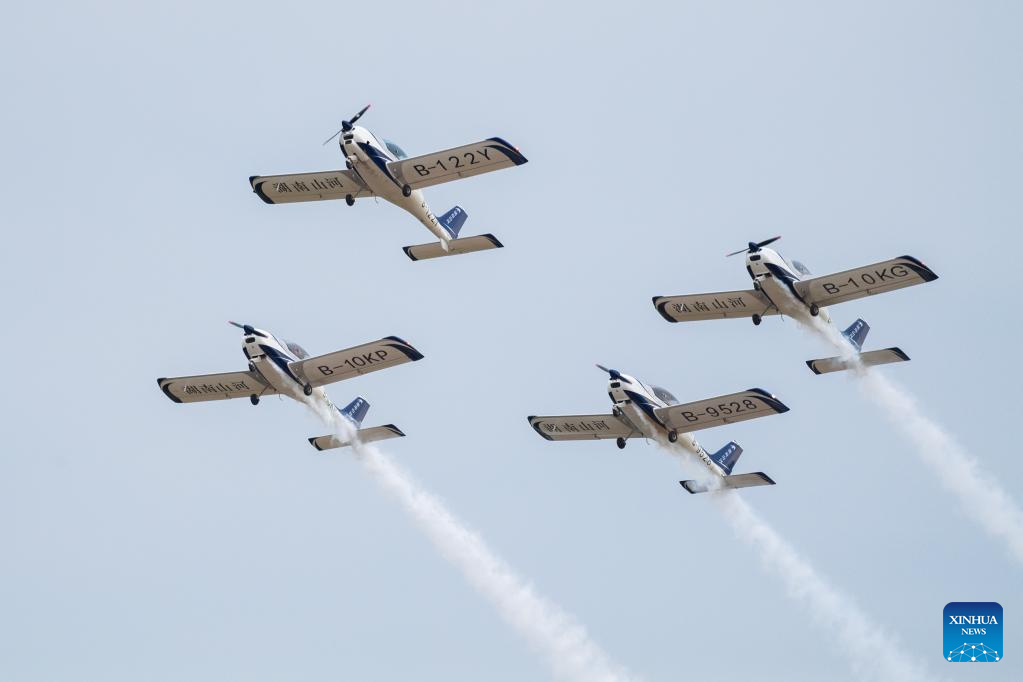 A fleet of fixed-wing aircraft fly during an air show, which is a part of the 2022 Hunan (International) General Aviation Industry Expo, at the Lusong Airport of Zhuzhou City, central China's Hunan Province, Sept. 1, 2022. The 2022 Hunan (International) General Aviation Industry Expo opened here on Thursday. The expo comprises a static exhibition at the Changsha International Convention and Exhibition Center in Changsha and an air show at the Lusong Airport of Zhuzhou City, both in central China's Hunan Province. (Xinhua/Chen Sihan)
