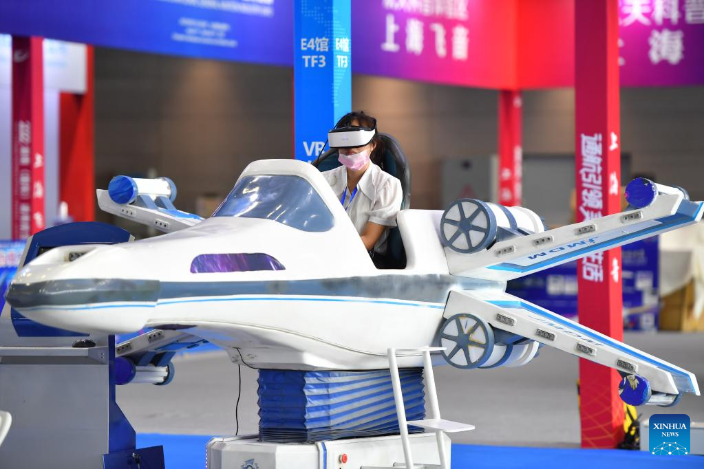 A visitor experience a VR flight simulator during the 2022 Hunan (International) General Aviation Industry Expo at the Changsha International Convention and Exhibition Center in Changsha, central China's Hunan Province, Sept. 1, 2022. The 2022 Hunan (International) General Aviation Industry Expo opened here on Thursday. The expo comprises a static exhibition at the Changsha International Convention and Exhibition Center in Changsha and an air show at the Lusong Airport of Zhuzhou City, both in central China's Hunan Province. (Xinhua/Chen Zeguo)