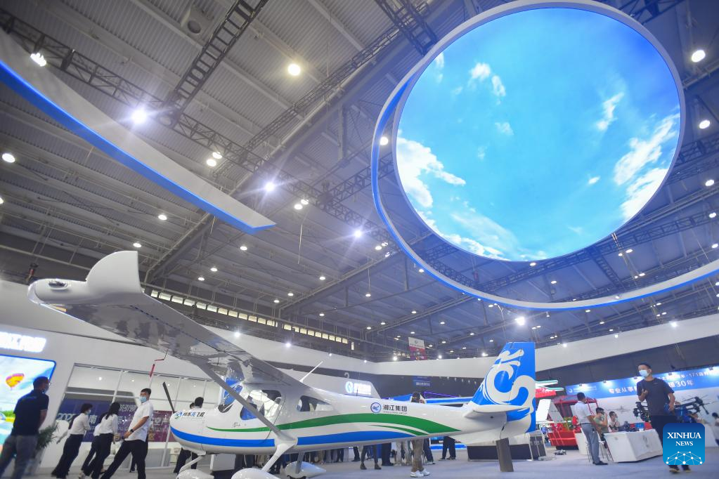 Visitors are seen during the 2022 Hunan (International) General Aviation Industry Expo at the Changsha International Convention and Exhibition Center in Changsha, central China's Hunan Province, Sept. 1, 2022. The 2022 Hunan (International) General Aviation Industry Expo opened here on Thursday. The expo comprises a static exhibition at the Changsha International Convention and Exhibition Center in Changsha and an air show at the Lusong Airport of Zhuzhou City, both in central China's Hunan Province. (Xinhua/Chen Zeguo)