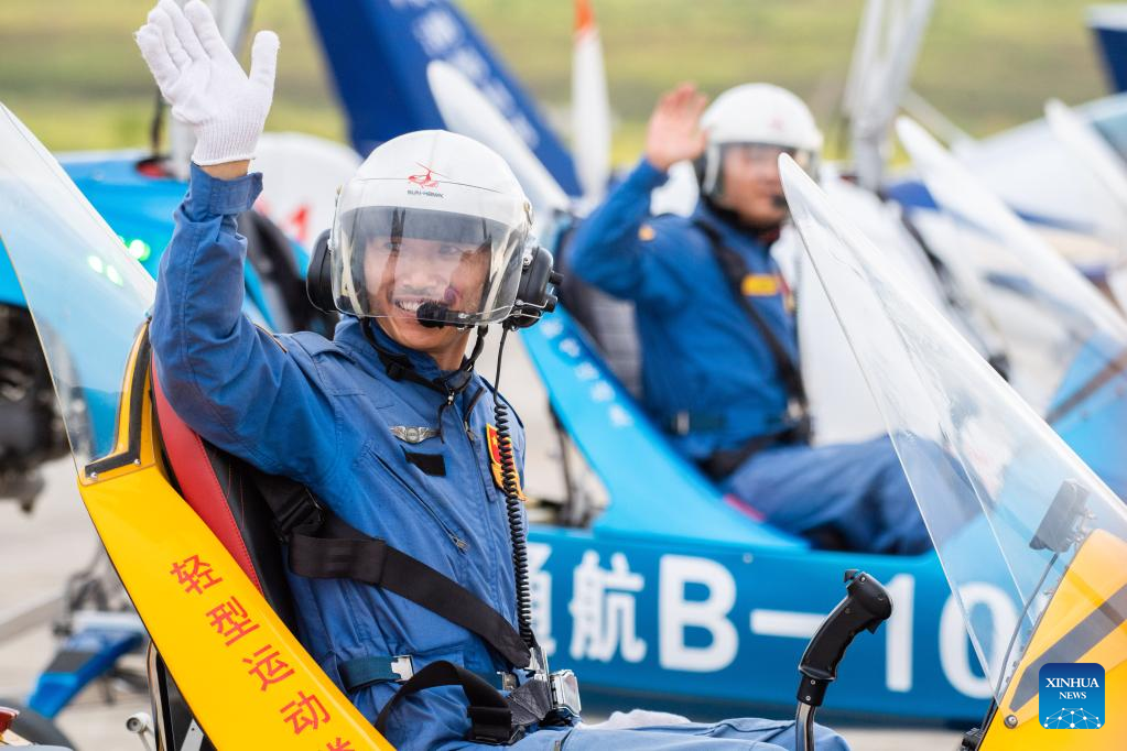 Pilots of gyroplanes wave to the audience after their performance during an air show, which is a part of the 2022 Hunan (International) General Aviation Industry Expo, at the Lusong Airport of Zhuzhou City, central China's Hunan Province, Sept. 1, 2022. The 2022 Hunan (International) General Aviation Industry Expo opened here on Thursday. The expo comprises a static exhibition at the Changsha International Convention and Exhibition Center in Changsha and an air show at the Lusong Airport of Zhuzhou City, both in central China's Hunan Province. (Xinhua/Chen Sihan)