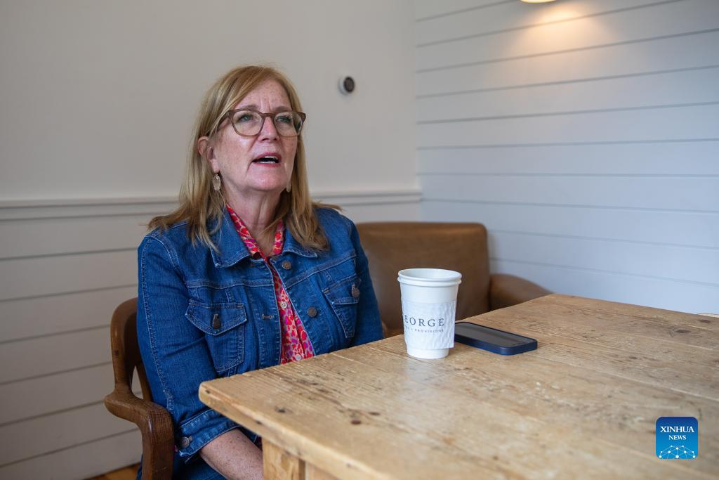 Tracy Fisher, a school board member from Coppell, speaks during an interview with Xinhua in Coppell, Texas, the United States, on Aug. 30, 2022. (Photo by Xin Jin/Xinhua)