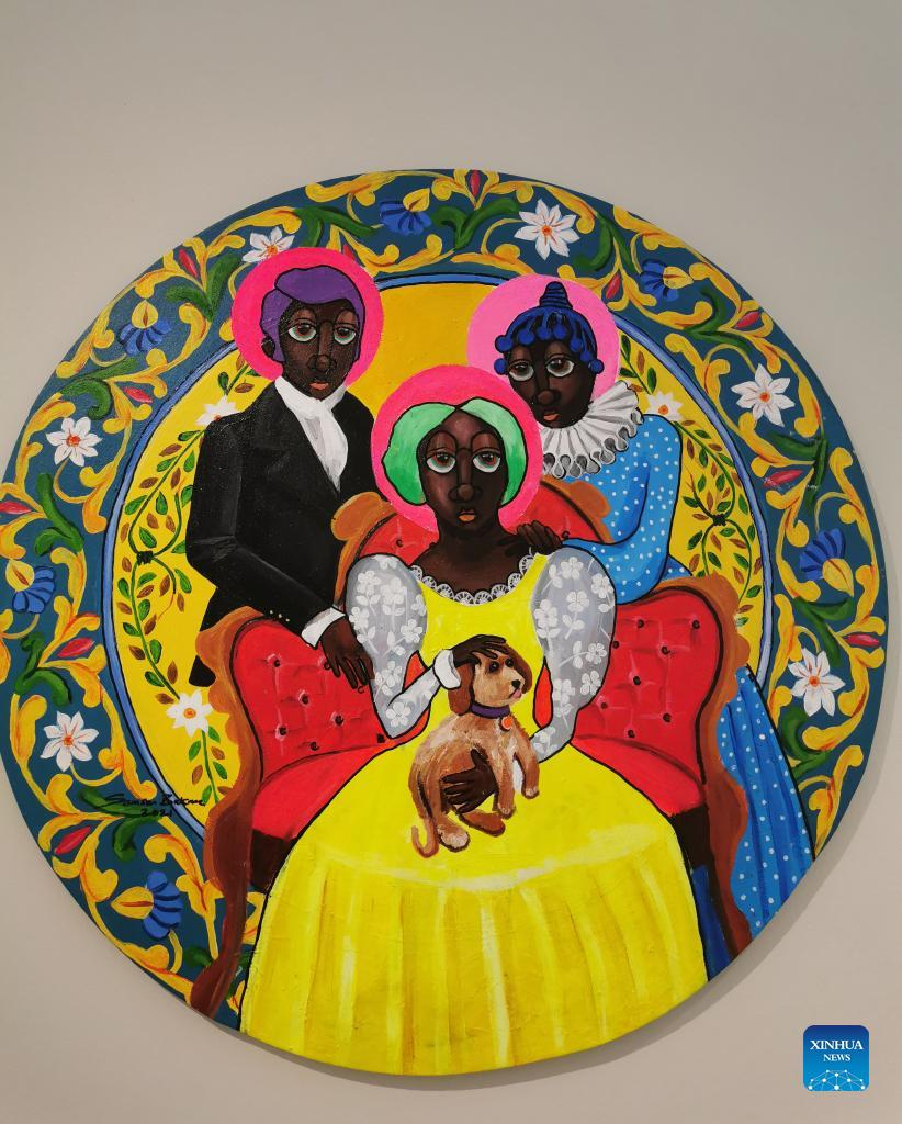 Photo taken on Sept. 1, 2022 shows a painting of a contemporary African art exhibition in Vilnius, capital of Lithuania. More than 30 contemporary African artworks by fifteen artists from six countries are on display. (Photo by Yang Weihua/Xinhua)