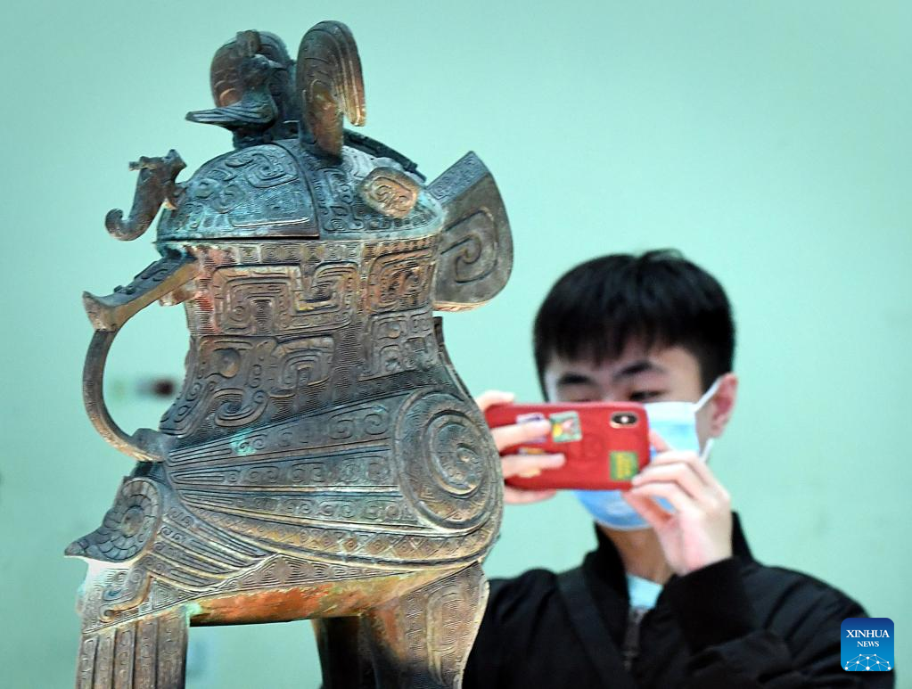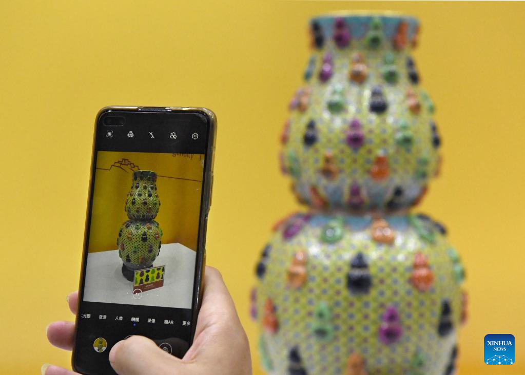 A visitor takes photos of an exhibit displayed at the 9th Chinese Museums and Relevant Products and Technologies Exposition (MPT-Expo) in Zhengzhou, capital of central China's Henan Province, Sept. 1, 2022. The 9th MPT-Expo opened here Thursday, where 437 museums across the country showcased their latest development and achievements in related areas. (Xinhua/Li An)