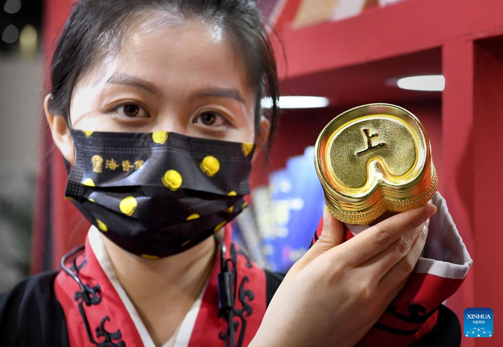 A staff member shows a creative product at the 9th Chinese Museums and Relevant Products and Technologies Exposition (MPT-Expo) in Zhengzhou, capital of central China's Henan Province, Sept. 1, 2022. The 9th MPT-Expo opened here Thursday, where 437 museums across the country showcased their latest development and achievements in related areas. (Xinhua/Li An)