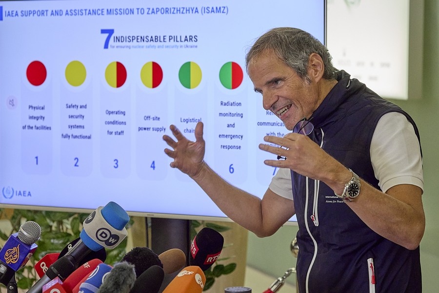 International Atomic Energy Agency (IAEA) Director General Rafael Grossi (2nd L) and other members of an expert team inspect the Zaporizhzhia nuclear power plant (NPP) in southern Ukraine, Sept. 1, 2022. (IAEA/Handout via Xinhua)
