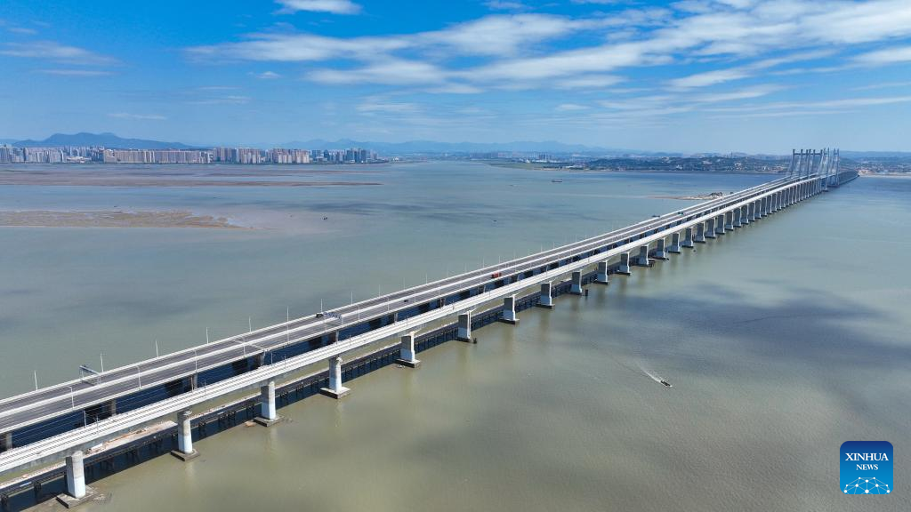 Aerial photo taken on Sept. 2, 2022 shows the Quanzhou Bay cross-sea bridge, a part of the Fuzhou-Xiamen high-speed railway, in southeast China's Fujian Province. With a designed speed of 350 km per hour, the 277-km Fuzhou-Xiamen high-speed railway is expected to slash the travel time from the province's capital Fuzhou to the tourist attraction Xiamen within one hour. (Xinhua/Lin Shanchuan)