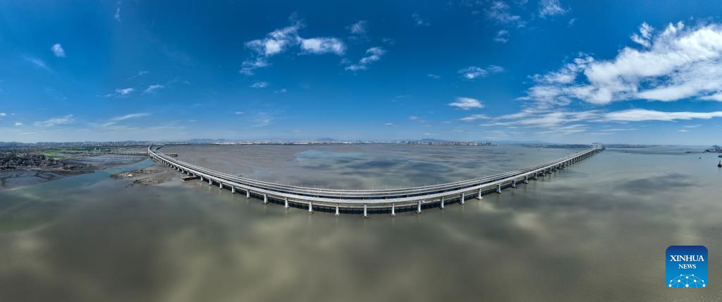Stitched aerial photo taken on Sept. 2, 2022 shows the Quanzhou Bay cross-sea bridge, a part of the Fuzhou-Xiamen high-speed railway, in southeast China's Fujian Province. With a designed speed of 350 km per hour, the 277-km Fuzhou-Xiamen high-speed railway is expected to slash the travel time from the province's capital Fuzhou to the tourist attraction Xiamen within one hour. (Xinhua/Zhou Yi)