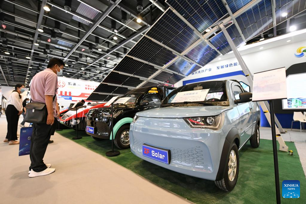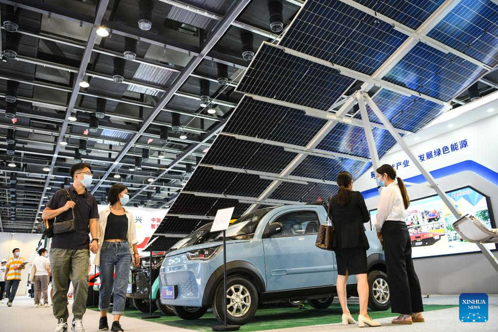 Visitors watch solar-powered cars at the environmental services exhibition during the 2022 China International Fair for Trade in Services (CIFTIS) in Beijing, capital of China, Sept. 3, 2022. The CIFTIS is held in Beijing from Aug. 31 to Sept. 5 at the China National Convention Center and Shougang Park. The environmental services exhibition, which is held for the first time, demonstrates the environmental protection, green technologies and applications. (Xinhua/Han Xu)
