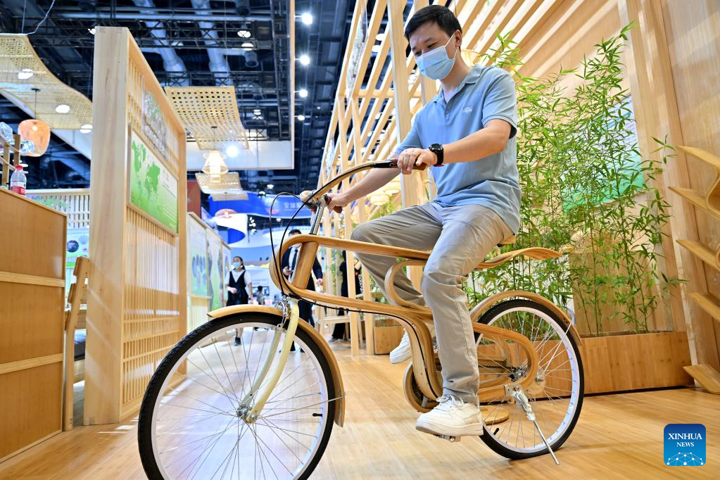 A visitor tries a bamboo bicycle at the environmental services exhibition during the 2022 China International Fair for Trade in Services (CIFTIS) in Beijing, capital of China, Sept. 3, 2022. The CIFTIS is held in Beijing from Aug. 31 to Sept. 5 at the China National Convention Center and Shougang Park. The environmental services exhibition, which is held for the first time, demonstrates the environmental protection, green technologies and applications. (Xinhua/Li Xin)