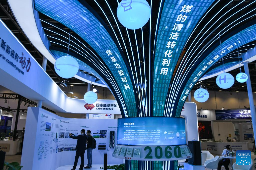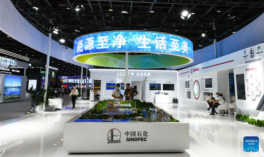 Photo taken on Sept. 3, 2022 shows a clean energy booth at the environmental services exhibition during the 2022 China International Fair for Trade in Services (CIFTIS) in Beijing, capital of China. The CIFTIS is held in Beijing from Aug. 31 to Sept. 5 at the China National Convention Center and Shougang Park. The environmental services exhibition, which is held for the first time, demonstrates the environmental protection, green technologies and applications. (Xinhua/Han Xu)