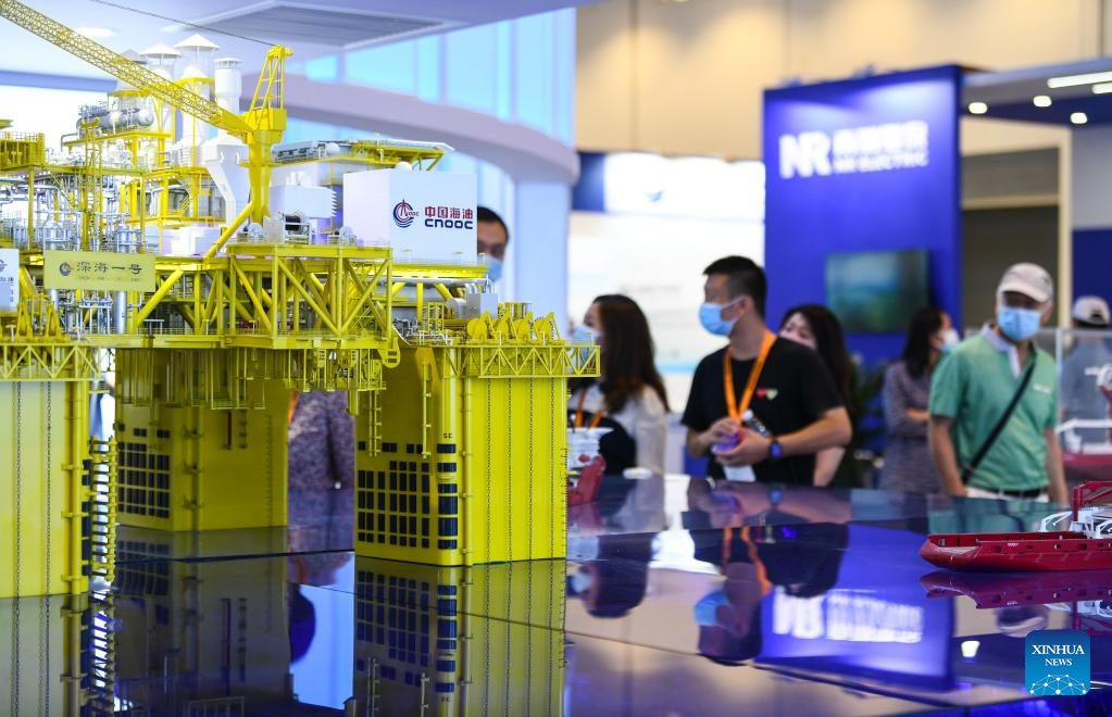 Photo taken on Sept. 3, 2022 shows a model of the Deep Sea No. 1 energy station at the environmental services exhibition during the 2022 China International Fair for Trade in Services (CIFTIS) in Beijing, capital of China. The CIFTIS is held in Beijing from Aug. 31 to Sept. 5 at the China National Convention Center and Shougang Park. The environmental services exhibition, which is held for the first time, demonstrates the environmental protection, green technologies and applications. (Xinhua/Han Xu)