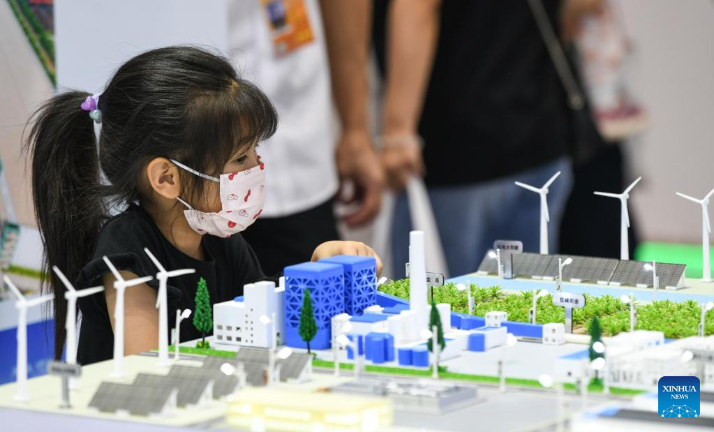 A girl watches a model related to carbon neutrality at the environmental services exhibition during the 2022 China International Fair for Trade in Services (CIFTIS) in Beijing, capital of China, Sept. 3, 2022. The CIFTIS is held in Beijing from Aug. 31 to Sept. 5 at the China National Convention Center and Shougang Park. The environmental services exhibition, which is held for the first time, demonstrates the environmental protection, green technologies and applications. (Xinhua/Han Xu)
