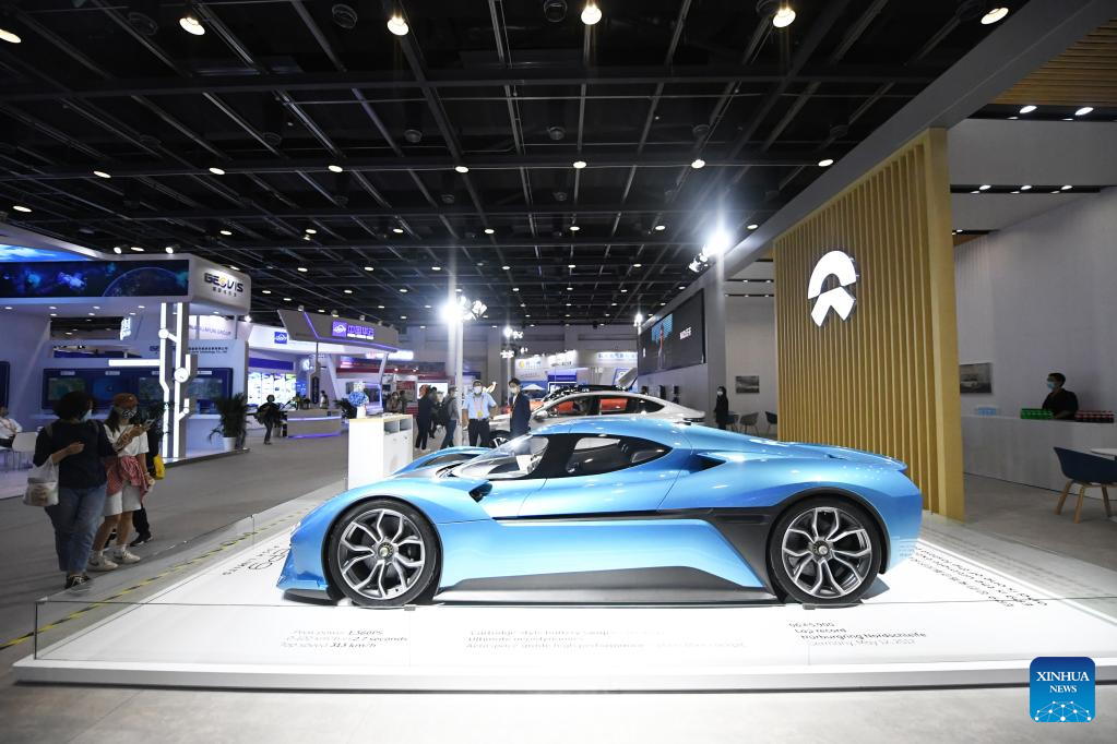 New energy vehicles are on display during the 2022 China International Fair for Trade in Services (CIFTIS) at the China National Convention Center in Beijing, capital of China, Sept. 3, 2022. The CIFTIS is held in Beijing from Aug. 31 to Sept. 5 at the China National Convention Center and Shougang Park. The environmental services exhibition, which is held for the first time, demonstrates the environmental protection, green technologies and applications. (Xinhua/Ren Chao)