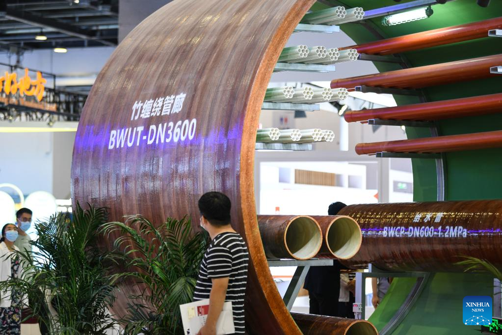 Visitors are seen at the environmental services exhibition during the 2022 China International Fair for Trade in Services (CIFTIS) in Beijing, capital of China, Sept. 3, 2022. The CIFTIS is held in Beijing from Aug. 31 to Sept. 5 at the China National Convention Center and Shougang Park. The environmental services exhibition, which is held for the first time, demonstrates the environmental protection, green technologies and applications. (Xinhua/Han Xu)