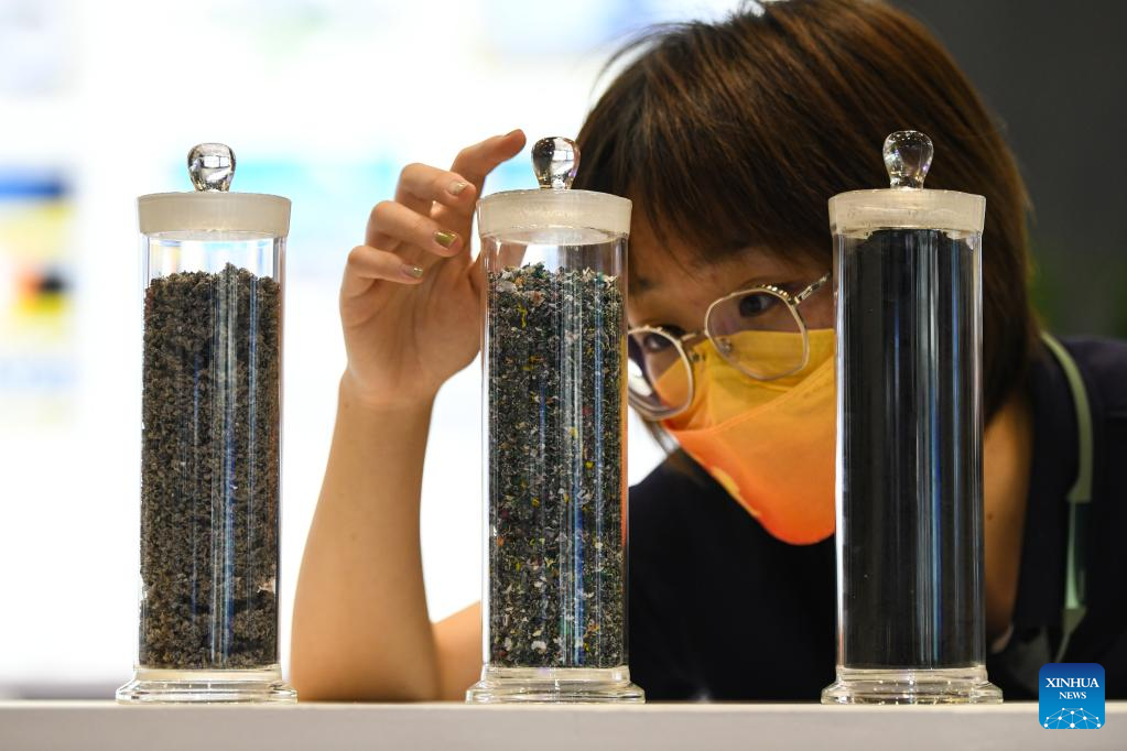 A visitor watches the solid recovered fuel at the environmental services exhibition during the 2022 China International Fair for Trade in Services (CIFTIS) in Beijing, capital of China, Sept. 3, 2022. The CIFTIS is held in Beijing from Aug. 31 to Sept. 5 at the China National Convention Center and Shougang Park. The environmental services exhibition, which is held for the first time, demonstrates the environmental protection, green technologies and applications. (Xinhua/Han Xu)