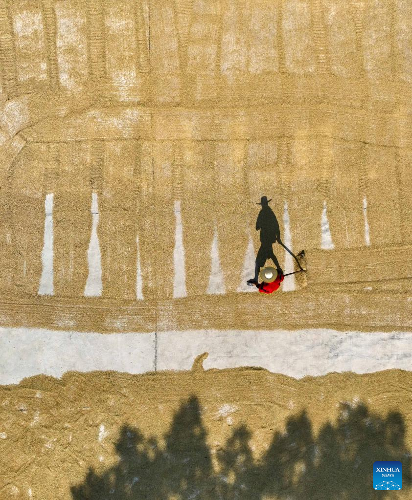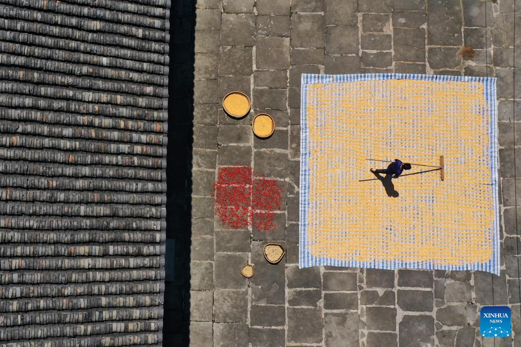 A villager airs rice in Yangjia Village of Danzhai County, Qiandongnan Miao and Dong Autonomous Prefecture, southwest China's Guizhou Province, Sept. 4, 2022. (Photo by Huang Xiaohai/Xinhua)