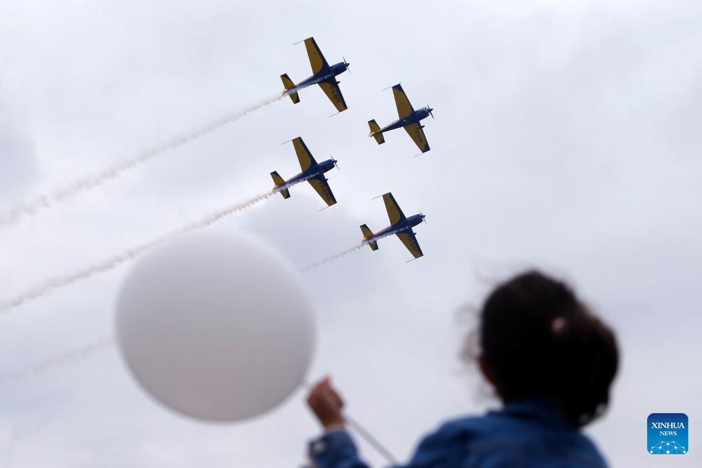 An aerobatic team performs during Bucharest International Air Show &General Aviation Exhibition in Bucharest, Romania, on Sept. 4, 2022. (Photo by Cristian Cristel/Xinhua)