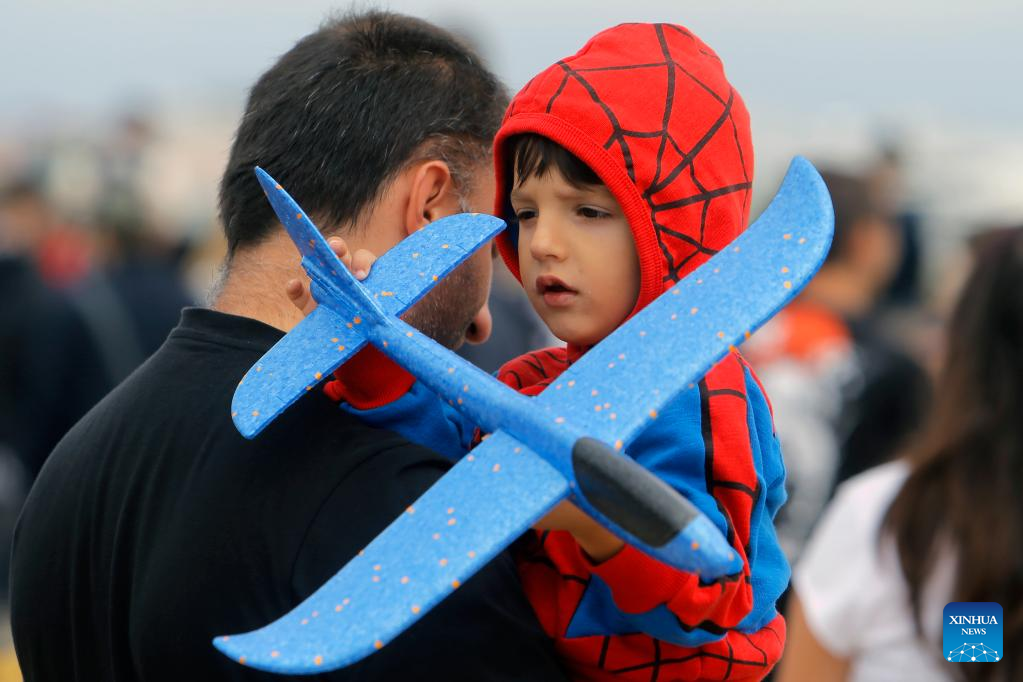 A child holds an airplane toy during Bucharest International Air Show &General Aviation Exhibition in Bucharest, Romania, on Sept. 4, 2022. (Photo by Cristian Cristel/Xinhua)