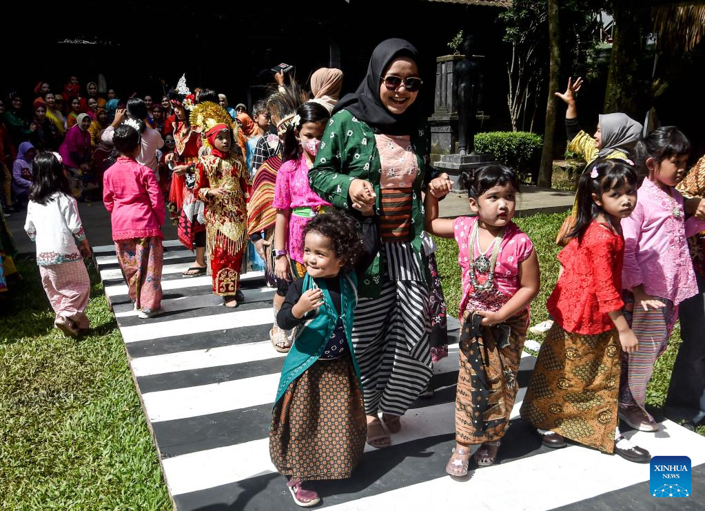 Children dressed in Kebaya, a traditional Indonesian costume, take part in a fashion show held at Rumah Budaya Nusantara Puspo Budoyo in South Tangerang, Banten Province, Indonesia, Sept. 4, 2022. (Xinhua/Agung Kuncahya B.)