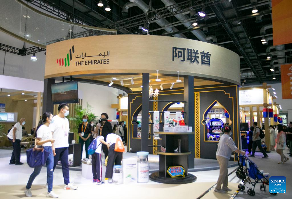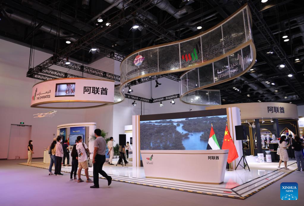People visit the booth of the United Arab Emirates (UAE) at the China National Convention Center during the 2022 China International Fair for Trade in Services (CIFTIS) in Beijing, capital of China, Sept. 3, 2022. (Xinhua/Zhang Fan)