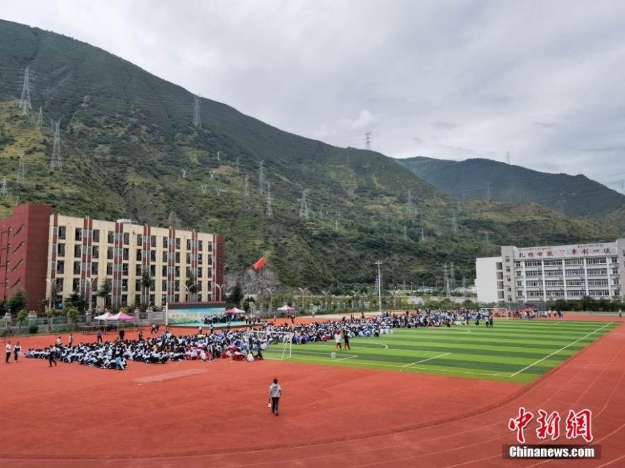 Students are evacuated to a playground after earthquake at Luding county, Ganzi Tibetan autonomous prefecture, southwest China's Sichuan Province, Sept. 5, 2022. (Photo provided to China News Service)