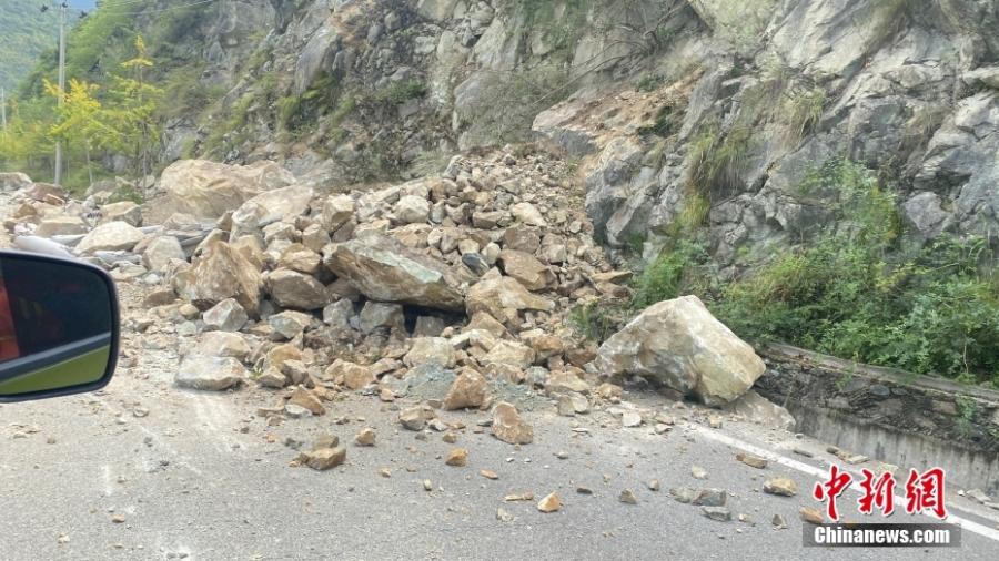 A damaged road by rock slide is seen on a highway at quake-hit Luding county, Ganzi Tibetan autonomous prefecture, southwest China's Sichuan Province after a 6.8-magnitude earthquake jolted Luding county, Sept. 5, 2022. (Photo provided to China News Service)