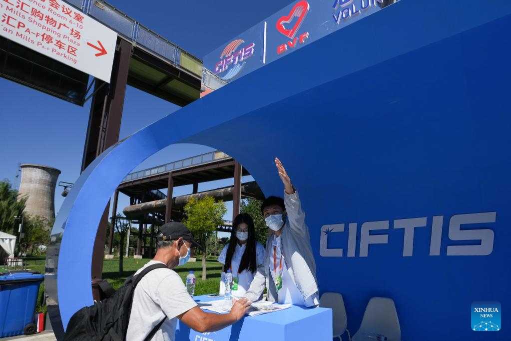 Volunteers guide visitors at the Shougang Park during the 2022 China International Fair for Trade in Services (CIFTIS) in Beijing, capital of China, Sept. 5, 2022. The 2022 CIFTIS closed on Monday. (Xinhua/Ju Huanzong)