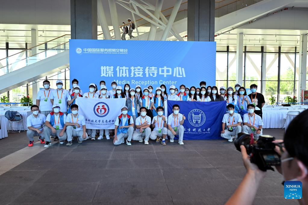Volunteers pose for a group photo at the media reception center of the Shougang Park during the 2022 China International Fair for Trade in Services (CIFTIS) in Beijing, capital of China, Sept. 5, 2022. The 2022 CIFTIS closed on Monday. (Xinhua/Li Xin)