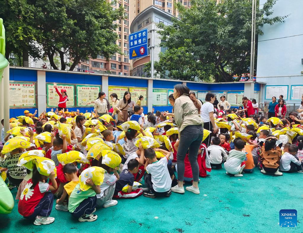Children are evacuated to the playground in a kindergarten in Shimian County of Ya'an City, southwest China's Sichuan Province, Sept. 5, 2022. (Xinhua)