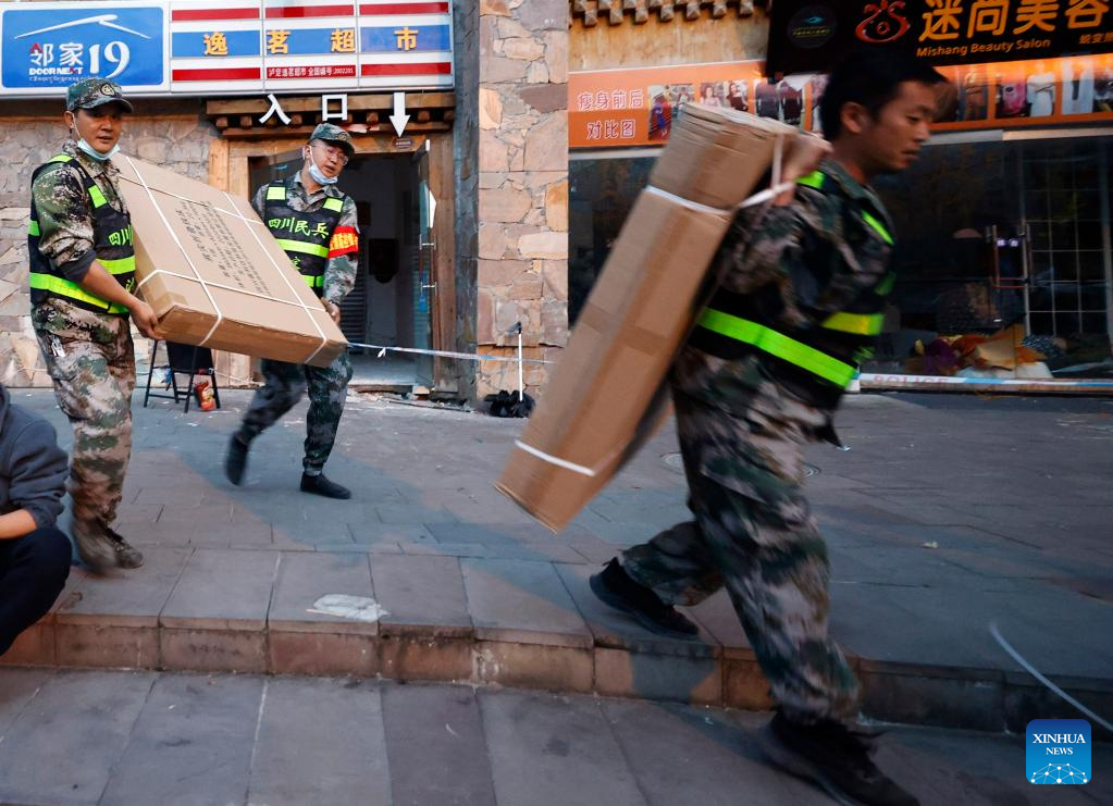 Rescue workers carry quake relief supplies in Moxi Township of Luding County, southwest China's Sichuan Province, Sept. 5, 2022. (Xinhua/Shen Bohan)