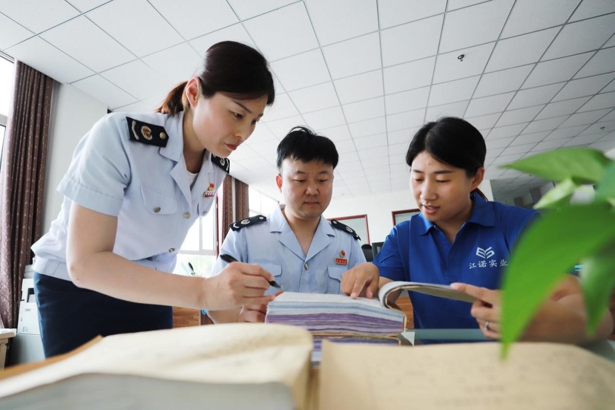 Staff members of a local tax bureau help an employee of a company based in Feixiang district, Handan city, north China's Hebei province with preparation of documents for applying for value-added tax credit refund, June 2022. (People's Daily Online/Xue Jiandong)