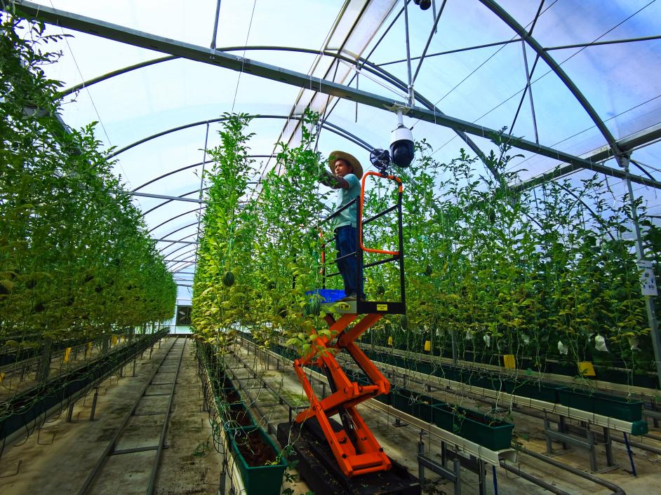 Lu Guojian, a resident in Lianzhang village, Yingde city of south China's Guangdong Province, harvests watermelons in a modern agricultural park. (People's Daily Online/Li Qiaochu)